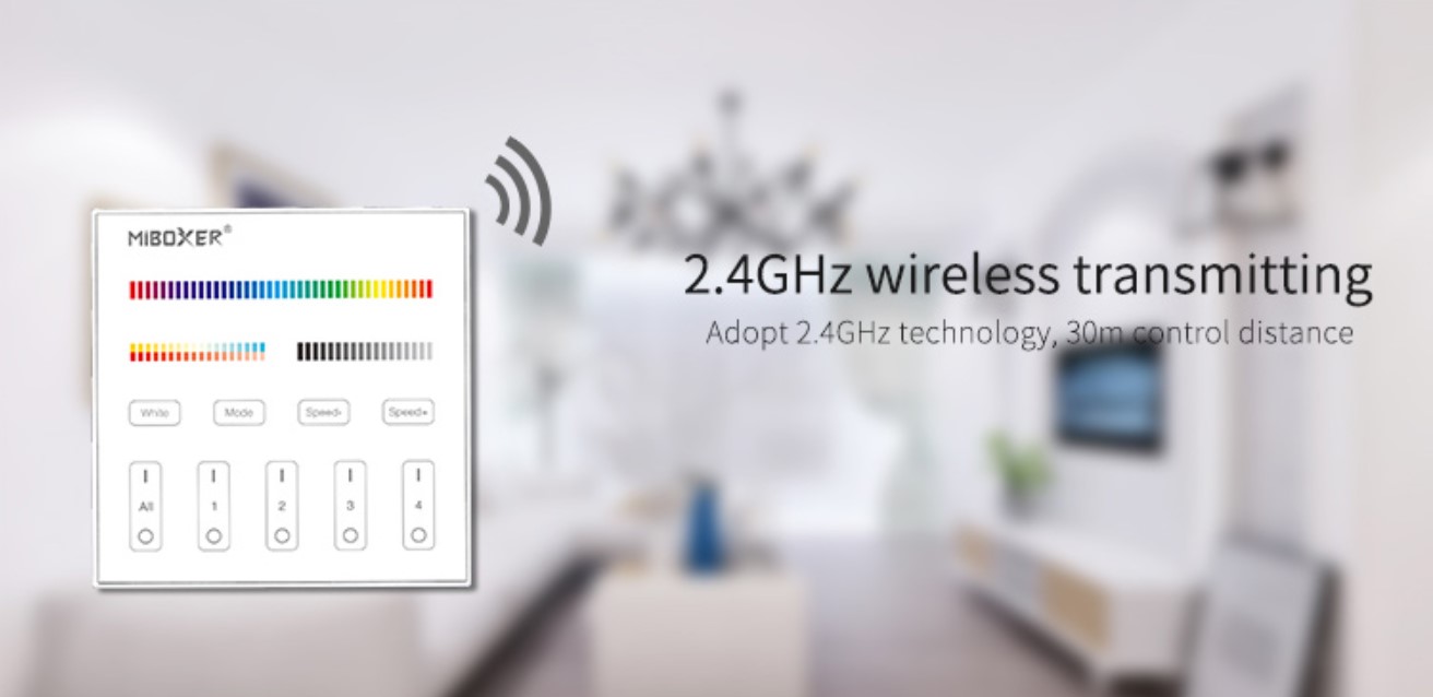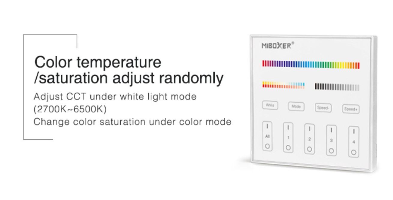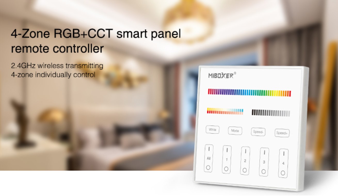 Dálkový ovladač s dotykovým panelem a funkcí RGB+CCT, který umožňuje ovládat až čtyři zóny LED světla s různými kombinacemi barev CCT, RGB, RGBW v domácnosti nebo komerční budově s osvětlením.